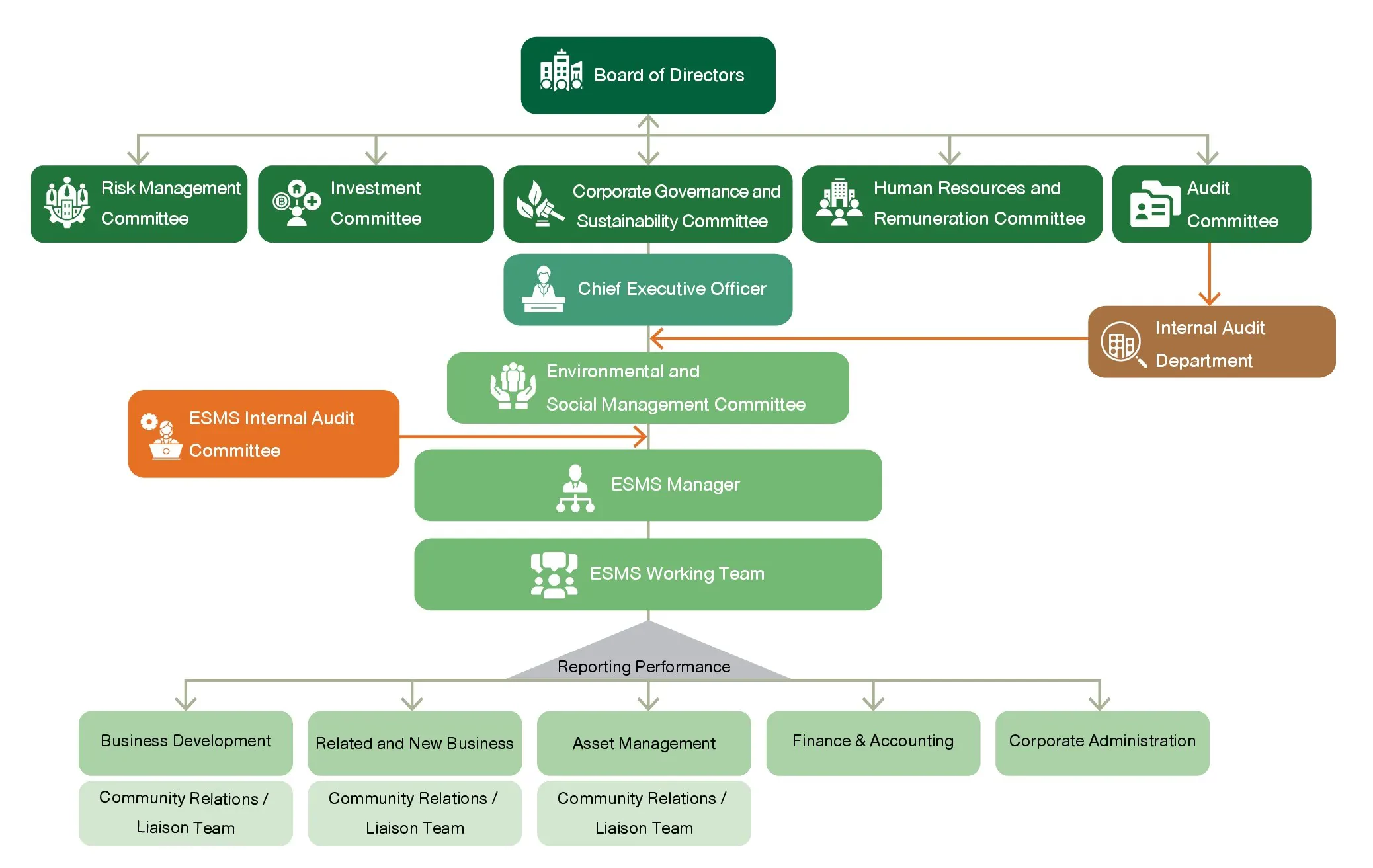 Under the Environmental and Social Management System (ESMS), RATCH has enforced the Environmental and Social Policy and assigned all personnel in line with the ESMS supervision structure, to drive the endeavor and ensure compliance with the manual and prescribed procedure. All functions are required to report their operations to the Board of Directors and relevant working committees for continuous improvements.