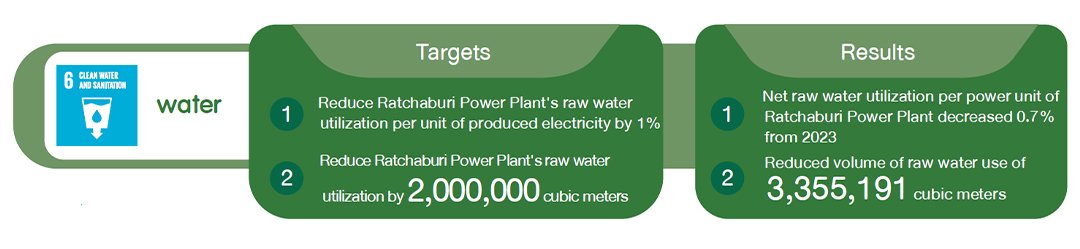 At Ratchaburi Power Plant which is the Company’s primary IPP plant (with 3,645 MW capacity), there have been continuous efforts to lower raw water withdrawal particularly for 3 combined cycle units which were operational all year. The goal was to bring down the water stress level in the Mae Klong River Basin. In 2024, the power plant reduced raw water consumption by 3,355,191 cubic meters.