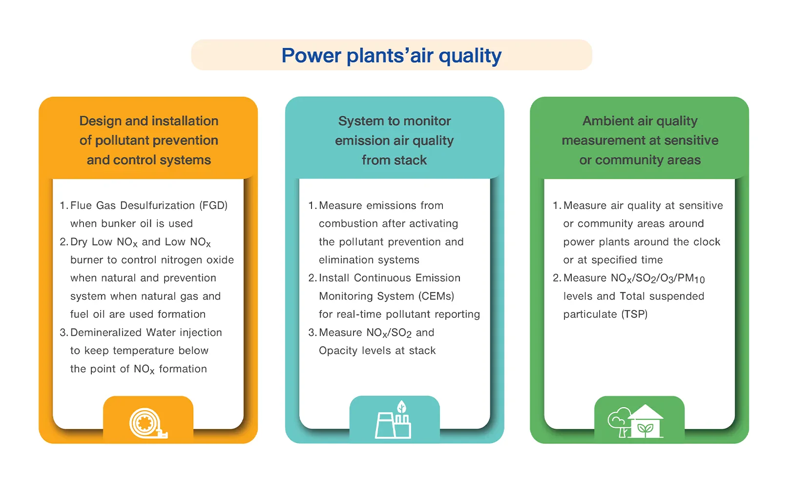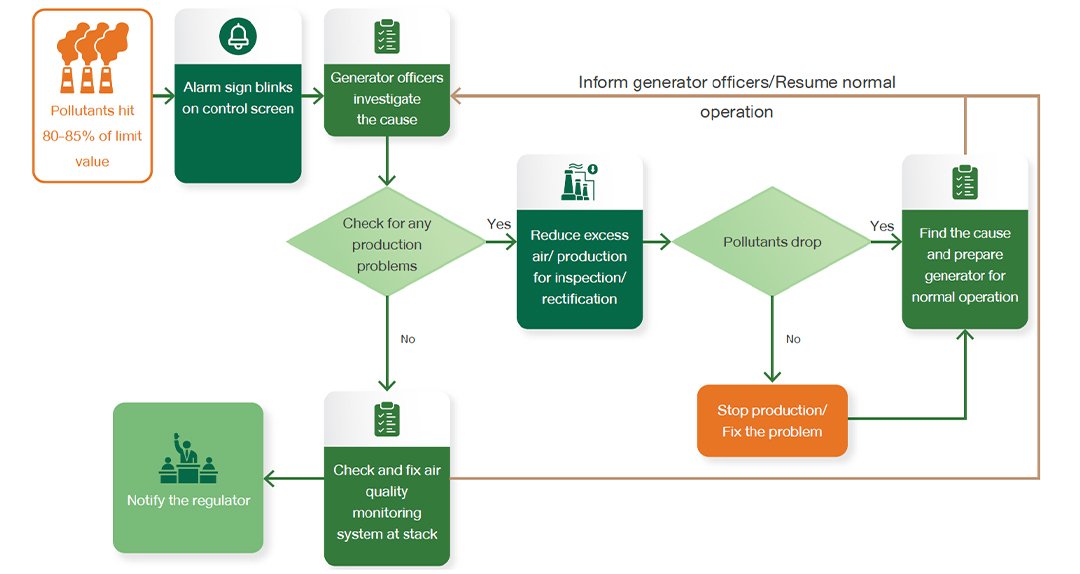 The power plants place a warning system to alert all involved when reported pollutants at stack hit 80-85% (High Alarm) or 95% (High High Alarm) of standard limits. The alarm sign will blink on control screens and controllers promptly check the production process and the monitoring system’s accuracy. Irregularities will be fixed as soon as possible while the regulator and relevant offices are notified of the incident. If the irregularities remain, the power plants will reduce production or eventually stop production until the situation returns to normal.
