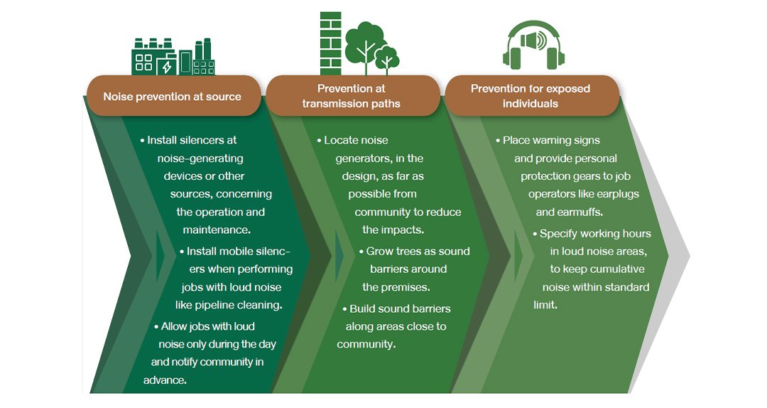 Noise generated by construction works and the operations and maintenance of power plants may cause impacts on community and living organisms as well as job operators in the areas. All power plants are thus equipped with noise control systems or devices that reduce noise at source, aside from other prevention measures that depend on the project’s conditions and the affected. The measures are set to deal with noise in 3 aspects: sources of noise, transmission paths and individuals exposed to the noise.