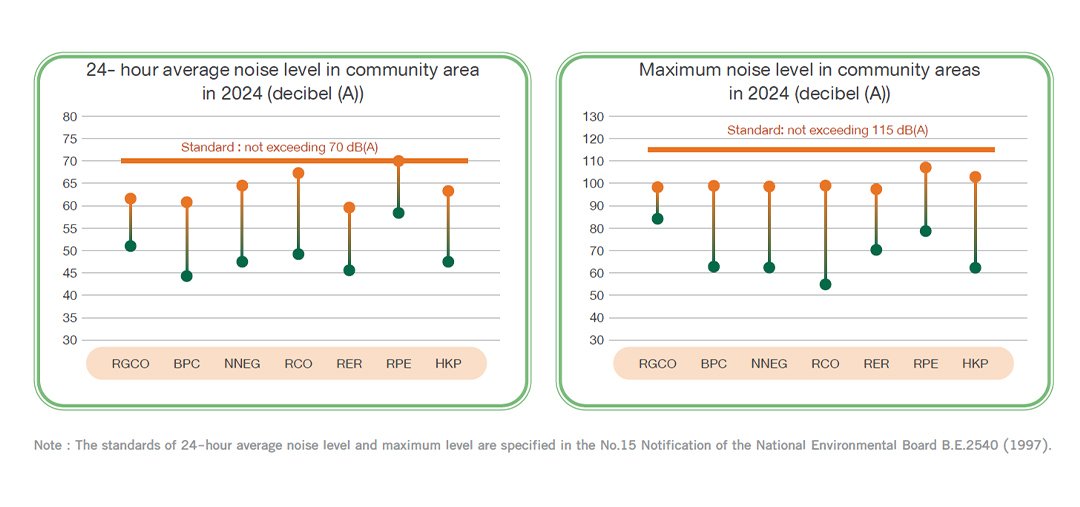 All 7 RATCH operational-controlled power plants in Thailand (contributing 62.05% of total revenue in 2024) were able to control noise impacts in line with EIA measures. The average noise level and maximum noise level in 2024 at the power plants and in community were within standard limits and did not cause impacts on community.