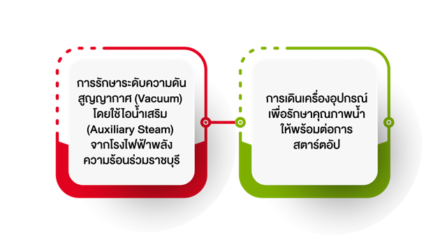 ในกระบวนการผลิตกระแสไฟฟ้าของโรงไฟฟ้าความร้อนราชบุรีแต่ละปี จะมีการสั่งเดินเครื่อง (Start Up) ตามสัญญาซื้อขายไฟฟ้าในรูปแบบโหมดต่าง ๆ ได้แก่ Cold, Hot และ Warm ซึ่งในช่วงก่อนการสตาร์ตอัป หรือระหว่างการหยุดเดินเครื่อง (Shutdown) ของโรงไฟฟ้าพลังความร้อนนั้น จะต้องมีการรักษาระดับความดันสูญญากาศ (Vacuum) และคุณภาพน้ำของระบบให้พร้อมสำหรับการสตาร์ตอัป แบบ Hot และ Warm Mode โดยใช้ระยะเวลาไม่น้อยกว่า 4 วัน หรือ 96 ชั่วโมง ทำให้เกิดการใช้พลังงานในช่วงเวลาดังกล่าว