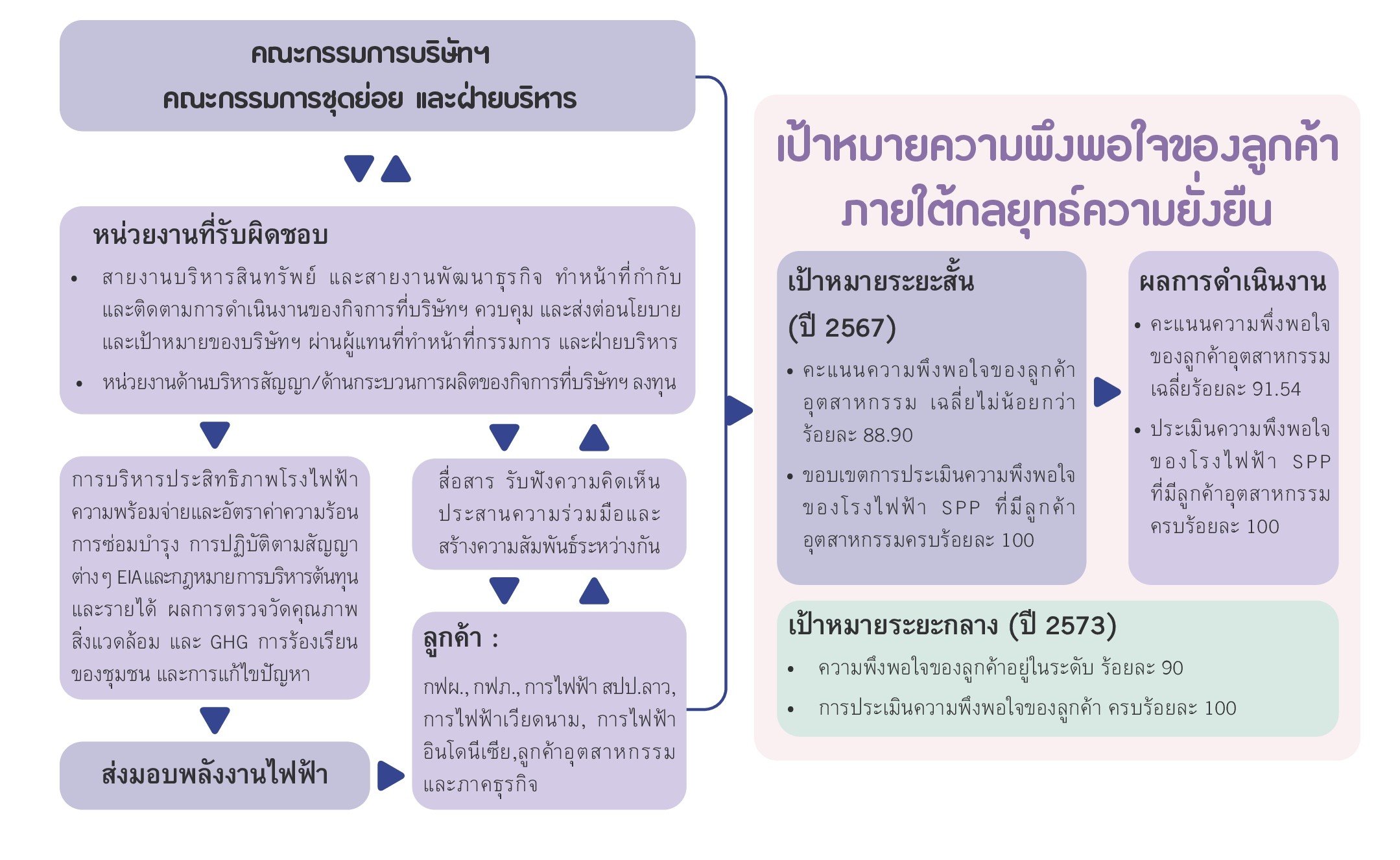 | ประเด็นความต้องการลูกค้าอุตสาหกรรม : คุณภาพสินค้าที่มั่นคงและต่อเนื่อง การจัดการ : ดำเนินการตรวจสอบระบบจำหน่ายไฟฟ้าและไอน้ำอย่างสม่ำเสมอ เพื่อลดความเสี่ยงต่อการส่งมอบสินค้าที่ไม่ได้คุณภาพและไม่ต่อเนื่อง |