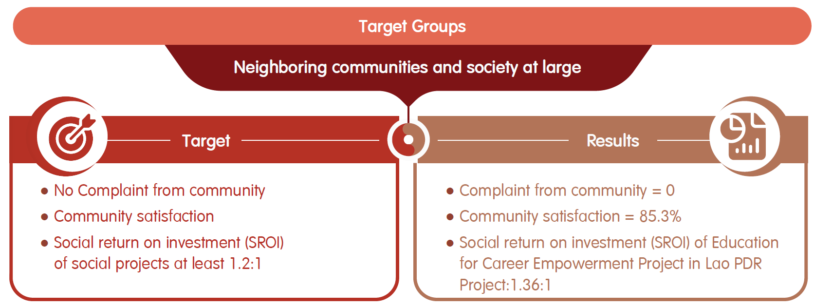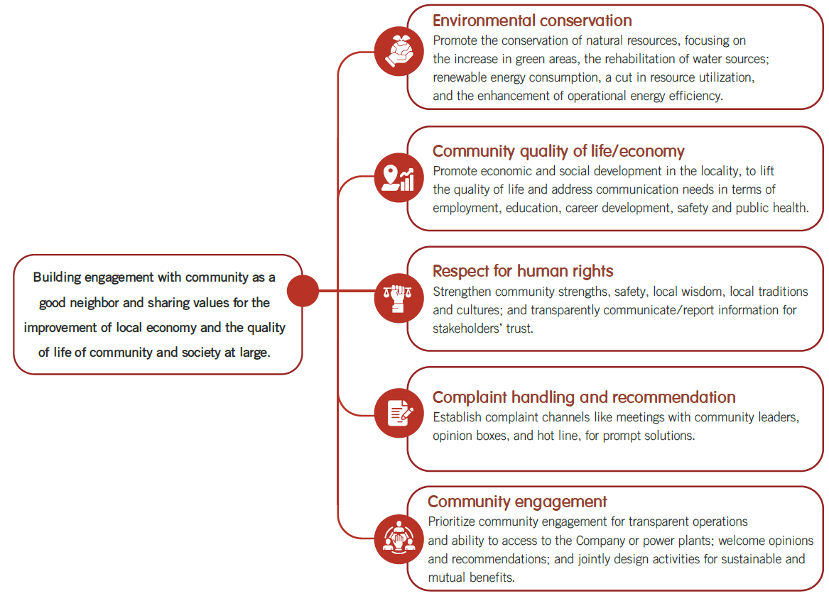The Company commits to operate its business adhering by sustainable development guidelines with aim to create the organization growth in all aspects; including economic value, shared social value, and environment. The corporate social responsibility focuses on community and social development to promote and support environmental conservation projects, energy conservation activities as well as enhancing living quality of people in communities and society at large in line with the Company’s strategy and business operations under the Company’s sustainability development policy and the social and environment policy which is governed by the corporate governance and sustainability committee