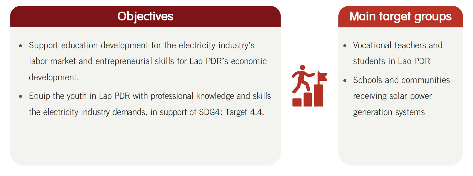 | Solar panel installation workshop for solar power generation | Senior vocational students, Integrated Technical-Vocational School of Nambak (Luang Prabang Province)’s Vocational Certificate Program | 20 |