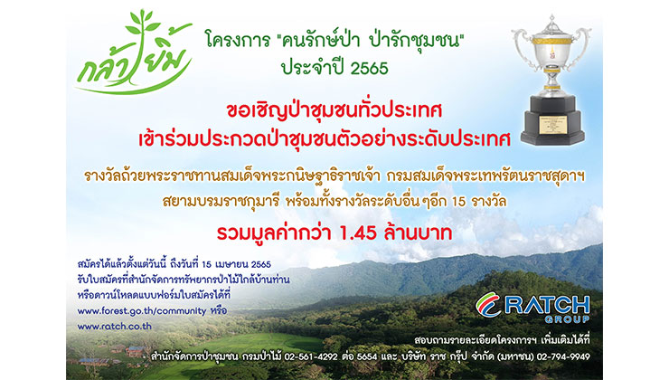 10 March 2022: The Royal Forest Department (RFD) and RATCH Group Public Company Limited (RATCH) cordially invite all registered community forests nationwide to participate in the 2022 community forest contest for winning the trophy of honour from HRH Princess Maha Chakri Sirindhorn and a reward of 200,000 baht. The contest organized by FRD and RATCH under the “Love the Forest and Community Program” is now open for application until 15 April 2022.
