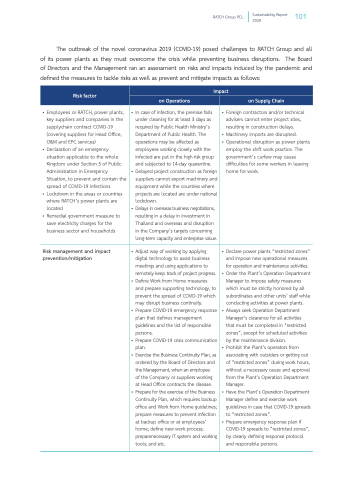 The outbreak of the novel coronavirus 2019 (COVID-19) posed challenges to RATCH Group and all of its power plants as they must overcome the crisis while preventing business disruptions. The Board of Directors and the Management ran an assessment on risks and impacts induced by the pandemic and defined the measures to tackle risks as well as prevent and mitigate impacts as follows: