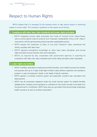 • RATCH integrates human rights principles into Code of Conduct (Link: https://www. ratch.co.th/en/cg/the-code-of-conduct) and Corporate Sustainability Policy (Link: https:// www.ratch.co.th/en/cg/corporate-policy/corporate-sustainability-policy).