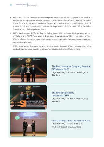 .• RATCH won Thailand Greenhouse Gas Management Organization (Public Organization)’s certificate and honorary plaque under Thailand Voluntary Emission Reduction Program (T-VER) for Ratchaburi Power Plant’s Sustainable Forestation Project and participation in Low Emission Support Scheme (LESS); and under Carbon Footprint for Organization (CFO) for Head Office, Ratchaburi Power Plant and Tri Energy Power Plant.