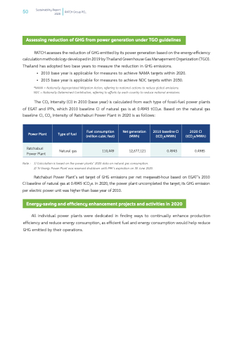 The CO2 Intensity (CI) in 2010 (base year) is calculated from each type of fossil-fuel power plants of EGAT and IPPs, which 2010 baseline CI of natural gas is at 0.4945 tCO2e. Based on the natural gas baseline CI, CO2 Intensity of Ratchaburi Power Plant in 2020 is as follows: