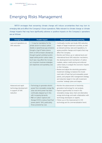 RATCH envisages that worsening climate change will induce uncertainties that may turn to emerging risks and affect the Company’s future operations. Risks relevant to climate change or climate change impacts that may have significantly adverse or positive impacts on the Company’s operations are as follows: