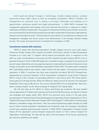 We will also step up the efforts to reduce greenhouse gas emissions. We have studied various approaches in Thailand and overseas and formed ESG Working Group, we expect to finalize new strategies and targets within 2021. RATCH has launched some actions in the past years. As a participant of Thailand Greenhouse Gas Management Organization (Public Organization) or TGO’s Thailand Voluntary Emission Reduction Program, RATCH developed 3 T-VER projects involving energy efficiency, renewable energy and forests. They had reduced greenhouse gases annually by 2,602 tons of carbon dioxide equivalent. Subsidiaries and companies under the Company’s operational control have prepared greenhouse gas inventory. In 2020, RATCH Cogeneration Company Limited kicked off the organization carbon footprint assessment based on TGO’s Carbon Footprint for Organization methodology. The data will be used in the formulation of the Group’s greenhouse gas reduction guidelines and targets.