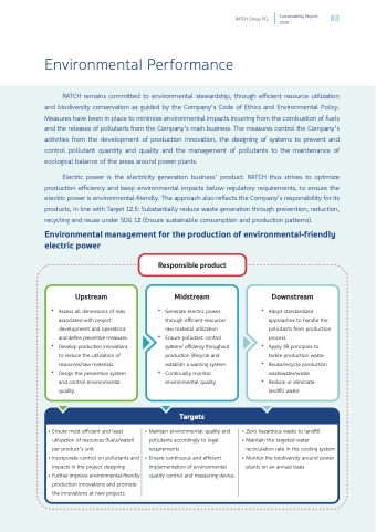 Electric power is the electricity generation business’ product. RATCH thus strives to optimize production efficiency and keep environmental impacts below regulatory requirements, to ensure the electric power is environmental-friendly. The approach also reflects the Company’s responsibility for its products, in line with Target 12.5: Substantially reduce waste generation through prevention, reduction, recycling and reuse under SDG 12 (Ensure sustainable consumption and production patterns).