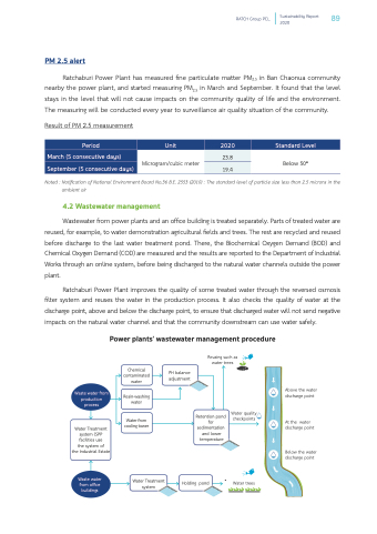 Wastewater from power plants and an office building is treated separately. Parts of treated water are reused, for example, to water demonstration agricultural fields and trees. The rest are recycled and reused before discharge to the last water treatment pond. There, the Biochemical Oxygen Demand (BOD) and Chemical Oxygen Demand (COD) are measured and the results are reported to the Department of Industrial Works through an online system, before being discharged to the natural water channels outside the power plant.
