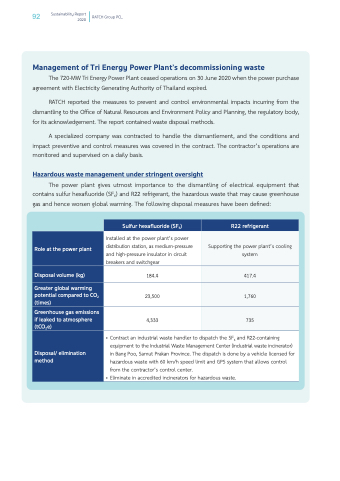 The power plant gives utmost importance to the dismantling of electrical equipment that contains sulfur hexafluoride (SF6) and R22 refrigerant, the hazardous waste that may cause greenhouse gas and hence worsen global warming. The following disposal measures have been defined: