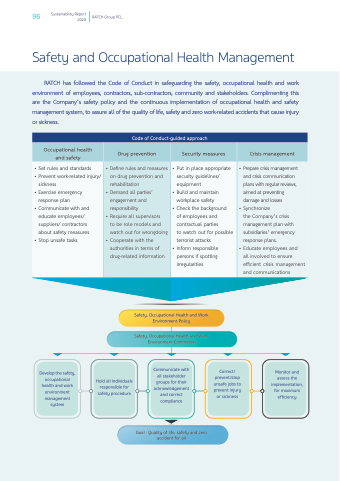 RATCH has followed the Code of Conduct in safeguarding the safety, occupational health and work environment of employees, contractors, sub-contractors, community and stakeholders. Complimenting this are the Company’s safety policy and the continuous implementation of occupational health and safety management system, to assure all of the quality of life, safety and zero work-related accidents that cause injury or sickness.