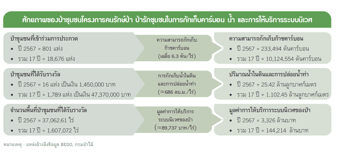 บริษัทฯ ยังคงสานต่อการสนับสนุนการดำเนินงานของป่าชุมชนทั่วประเทศผ่านโครงการคนรักษ์ป่า ป่ารักชุมชนต่อเนื่องมาจนถึงปัจจุบัน ในปี 2567 บริษัทฯ ได้จัดกิจกรรมการประกวดป่าชุมชน โดยสนับสนุนเงินรางวัลแก่ป่าชุมชนที่ได้รับรางวัลชนะเลิศและรองชนะเลิศระดับประเทศ ป่าชุมชนชนะเลิศระดับภาค และป่าชุมชนดีเด่นด้านการพัฒนา รวม 16 แห่ง ซึ่งเป็นป่าชุมชนที่ตั้งอยู่ในภาคเหนือ ภาคตะวันออกเฉียงเหนือ ภาคใต้ ภาคกลางและภาคตะวันออก คิดเป็นพื้นที่ป่ารวม 37,062.61 ไร่ ซึ่งสามารถกักเก็บคาร์บอนได้ประมาณ 233,494 ตัน หรือคิดเป็นปริมาณการกักเก็บก๊าซเรือนกระจกได้ 856,146 ตันคาร์บอนไดออกไซด์ นอกจากนี้ป่าชุมชนเหล่านี้ยังมีศักยภาพในการกักเก็บน้ำในดินและปล่อยน้ำท่า รวมถึงสร้างมูลค่าการให้บริการระบบนิเวศของป่าในด้านความหลากหลายทางชีวภาพได้เป็นอย่างมาก