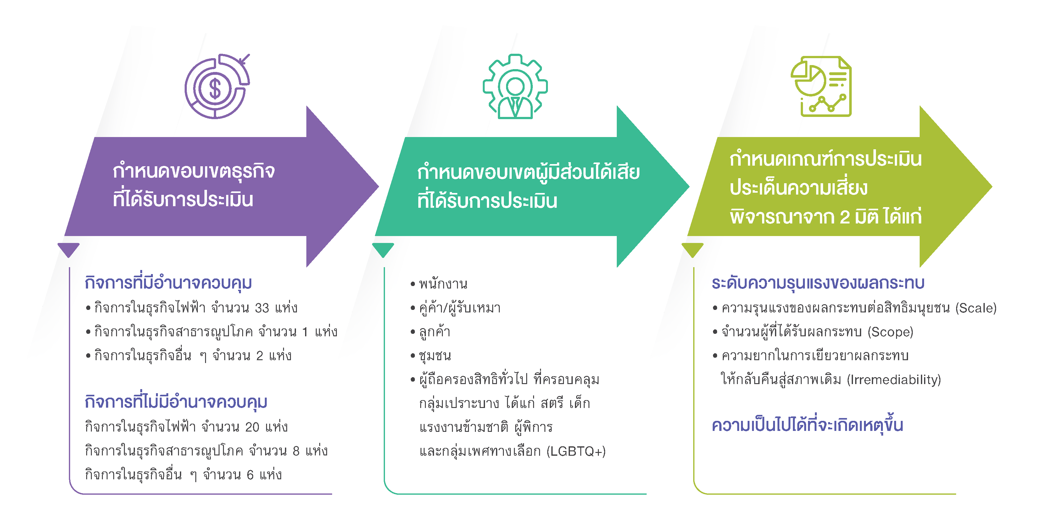 - ประเด็นที่มีโอกาสจะส่งผลกระทบต่อผู้ทรงสิทธิและกลุ่มเปราะบางจะถูกระบุเป็นประเด็นความเสี่ยง