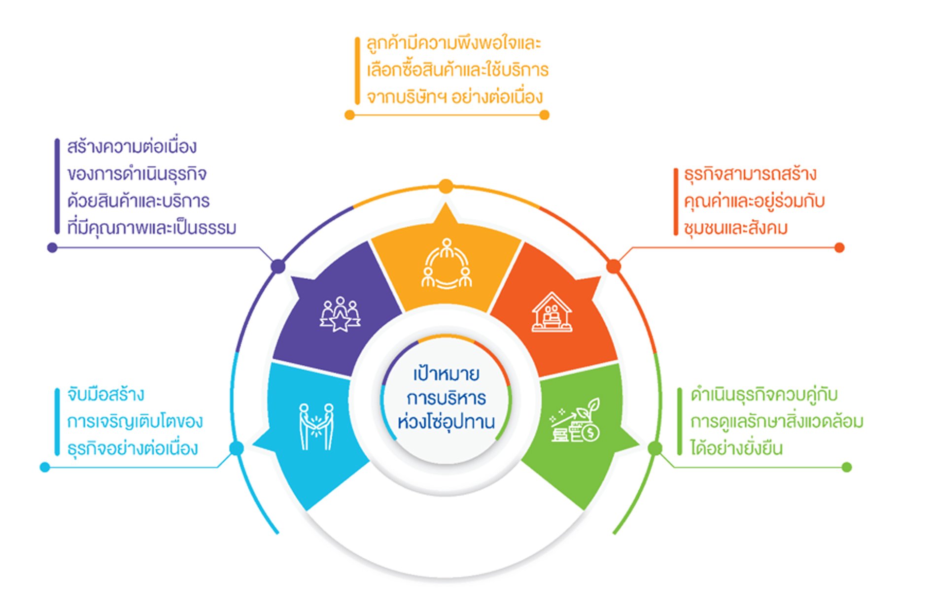 บริษัทฯ ได้ตระหนักถึงและให้ความสำคัญกับการบริหารห่วงโซ่อุปทาน โดยได้กำหนดเป็นแนวปฏิบัติต่อผู้มีส่วนได้เสียไว้ในจรรยาบรรณของบริษัทฯ ครอบคลุมตั้งแต่ผู้ถือหุ้น พนักงาน เจ้าหนี้ พันธมิตรธุรกิจ คู่ค้าหรือผู้จัดหาสินค้า คู่แข่งทางธุรกิจ ภาครัฐ ชุมชน สังคม และสิ่งแวดล้อม