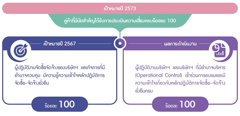 ในปี 2567 บริษัทฯ ได้มุ่งส่งเสริมให้คู่ค้าเข้าร่วมเป็นภาคีเครือข่ายการต่อต้านการทุจริตและคอร์รัปชัน เพื่อเป็นการสนับสนุนการดำเนินงานด้านธรรมาภิบาลให้กับกลุ่มคู่ค้า ซึ่งบริษัทฯ โดยหน่วยงานจัดซื้อ-จัดจ้างร่วมกับฝ่ายตรวจสอบภายในได้ร่วมคัดกรองคู่ค้า SME ของบริษัทฯ เพื่อส่งเสริมกลุ่มคู่ค้าที่มีขนาดเล็กซึ่งอาจยังไม่มีการดำเนินงานด้านการต่อต้านการทุจริตและคอร์รัปชันอย่างเป็นรูปธรรม พร้อมประสานงานเชิญชวนคู่ค้าเข้าร่วมโครงการแนวร่วมการต่อต้านการทุจริตและคอร์รัปชัน โดยปีที่ผ่านมา บริษัทฯ ได้ประสานงานเชิญชวนคู่ค้าจำนวน 41 ราย ซึ่งหากมีคู่ค้ารายใดที่มีความประสงค์จะเข้าร่วมโครงการ บริษัทฯ จะเป็นที่ปรึกษาให้คำแนะนำต่อคู่ค้าในการกำหนดนโนยบายและแนวปฏิบัติด้านการต่อต้านการทุจริตและคอร์รัปชัน เพื่อให้สามารถผ่านการรับรองการเป็นสมาชิกแนวร่วมต่อต้านการทุจริตและคอร์รัปชันในอนาคตได้