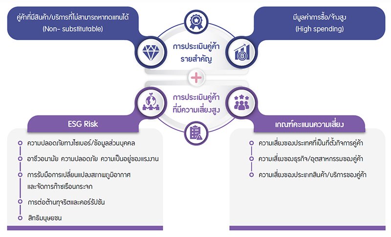 บริษัทฯ จึงได้กำหนดแนวทางการบริหารความเสี่ยงคู่ค้าตามลักษณะของความเสี่ยงที่อาจเกิดขึ้นจากการดำเนินงานของคู่ค้าในประเด็นด้าน ESG ควบคู่กับการกำกับดูแลให้คู่ค้าของบริษัทฯ ปฏิบัติตามหลักจรรยาบรรณคู่ค้า เพื่อป้องกันและลดโอกาสที่จะเกิดปัญหาและผลกระทบ